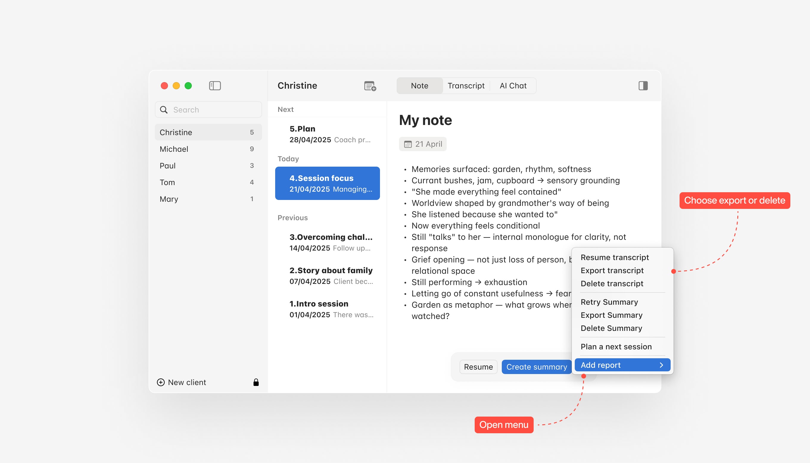 From the bottom Three-dot menu, Export the transcript or Delete it permanently. Same way it works for the Summary and the Reports