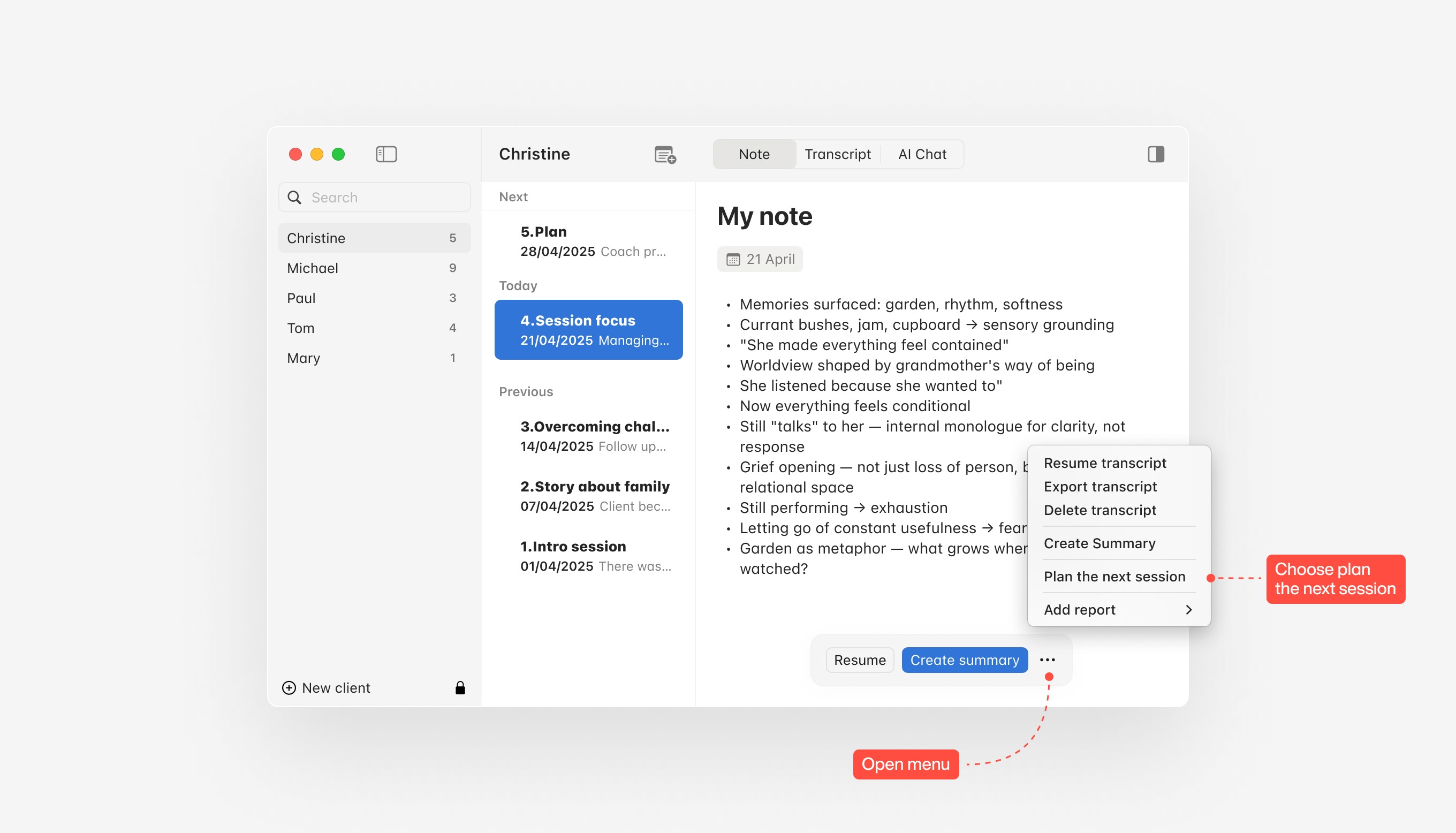 Knots can create a new session with a short recap of the previous one — including homework and themes to discuss with the client.