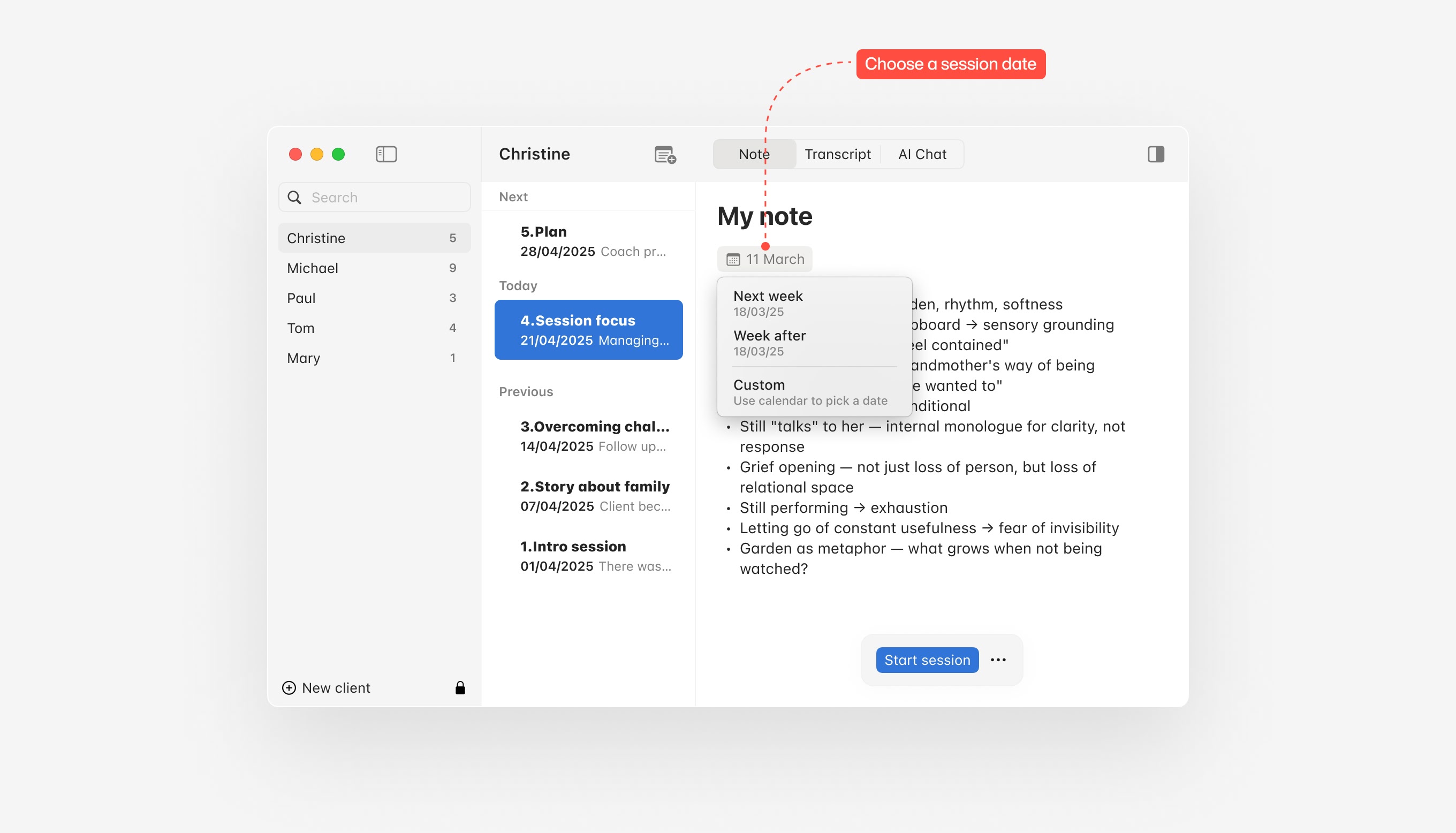 When you create a note, the Date appears at the top under My Note. Click on it to open the menu — choose one of the options or enter a custom date manually.