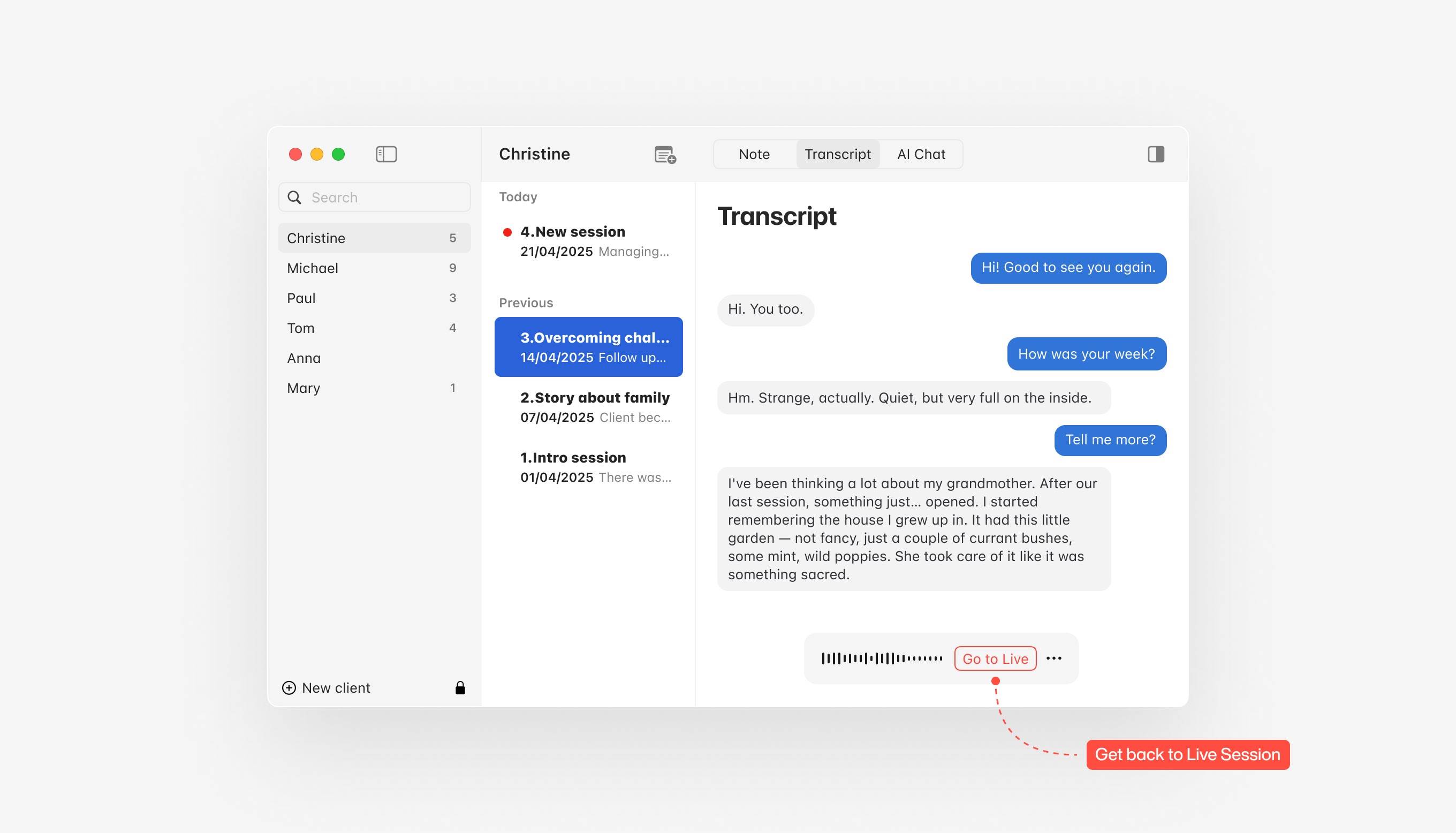 The active session stays marked with a small red dot — so you always know which one is live and can return to it anytime. Or click Go to live to jump to the active immediately.